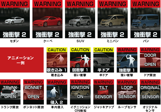 異常の発生はフルカラーアニメーション表示で瞬時に通報します。警報中に危険度の高い異常が発生した場合は、逐一情報が更新されますので、愛車の状況が手に取るようにわかります。